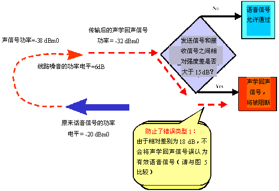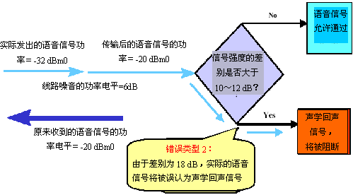 然而,如果判斷過程是根據(jù)功率電平的相對差異來進行的(而不是絕對差異),測量結(jié)果將更為準(zhǔn)確。通過在靜音期間測量兩個傳輸方向上的線路功率電平,就能得知相對的功率電平差異。使用在靜音期間獲得的信息,在分類信號前(即決定信號是聲學(xué)回聲還是有效語音),對呼叫兩端的功率電平差異進行修正,就能更加準(zhǔn)確地了解相對信號強度。該方法稱為智能語音檢測,它能顯著降?quot;錯誤類型1"出現(xiàn)的可能性,如圖9所示。注意,在分析該方法時,請比對圖5和圖9。