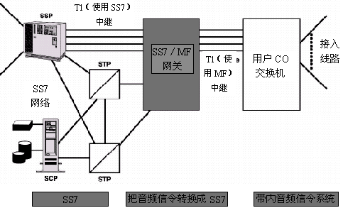 如圖14所示,SS7/MF網(wǎng)關(guān)可以實現(xiàn)SS7信令到MF(多頻)信令的轉(zhuǎn)換,使現(xiàn)有MF信令交換機(jī)無須升級就能擁有SS7信令能力;旌狭薙S7和基于音頻信令的呼叫建立環(huán)境能為各種運營商經(jīng)濟(jì)實用的SS7網(wǎng)絡(luò)接入方案,采用這一方案的有蜂窩電話運營商、本地電話運營商、長途電話運營商和其它一些仍使用舊式交換機(jī)的電話運營商。