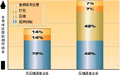 如圖4所示,是一個(gè)典型VoP系統(tǒng)大約的相對(duì)成本構(gòu)成。第一根柱圖代表無(wú)壓縮語(yǔ)音業(yè)務(wù),而第二根柱圖代表壓縮語(yǔ)音業(yè)務(wù)。這個(gè)柱形圖說(shuō)明:回聲抑制和壓縮是實(shí)現(xiàn)這類網(wǎng)關(guān)的語(yǔ)音處理技術(shù)中成本最高的兩個(gè)功能。如果這兩種業(yè)務(wù)功能通過(guò)某一技術(shù)實(shí)現(xiàn)而能在密度和功耗方面得到一個(gè)數(shù)量級(jí)性質(zhì)的改善,那麼人人都能從中受惠。