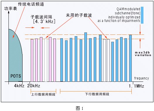 DSL技術(shù)是在人們對高速互聯(lián)網(wǎng)訪問需求推動下的產(chǎn)物。DSL利用頻率復(fù)用和OFDM調(diào)制技術(shù),在不影響傳統(tǒng)電話業(yè)務(wù)的前提下可以為用戶提供最高達8Mbps的數(shù)據(jù)傳輸速率。這個速率是基于POTS的Modem速率(以目前的最高速率56kbps為參考)的140倍;DSL技術(shù)所帶來的巨大帶寬為家庭和小型公司提供了一個寬帶數(shù)字業(yè)務(wù)的新平臺。這個DSL平臺可以支持多種寬帶業(yè)務(wù):包括高速Internet接入、虛擬專網(wǎng)及VOD等流媒體業(yè)務(wù)。其基本原理如下圖1所示: