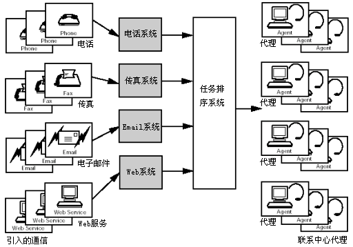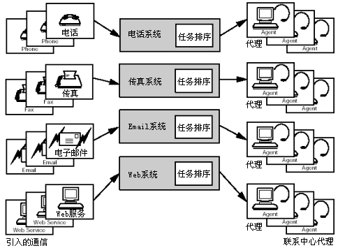 對通信媒體多樣性的支持是非常重要的,其中通信媒體包括電話、交互語音應(yīng)答、email、Web業(yè)務(wù)、傳真以及文件處理。為了處理通信媒體的多樣性,系統(tǒng)可能被分成多個子系統(tǒng),每個子系統(tǒng)對應(yīng)一種媒體類型。子系統(tǒng)將輸入的通信信息通知給負載序列,并且一直保留該通信信息,直到收到負載序列準(zhǔn)備路由該通信信息的消息。然后子系統(tǒng)按照負載序列的指令將通信信息發(fā)送到正確的代理坐席或設(shè)備。