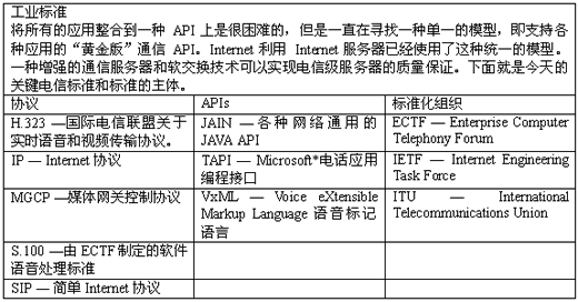 如今我們可以看到這種趨勢(shì)的例子。新一代的有競(jìng)爭(zhēng)力的業(yè)務(wù)提供商正在利用在綜合網(wǎng)絡(luò)中像語(yǔ)音門戶,統(tǒng)一消息,和v_Business這些領(lǐng)域中涌現(xiàn)出來的機(jī)會(huì)。這些業(yè)務(wù)提供商還用像個(gè)人助理,Internet會(huì)議,以及Internet呼叫等待這樣一些耳熟能詳?shù)膽?yīng)用在Internet上推出了下一代服務(wù)。