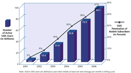 SMS在美國(guó)的使用落后于歐洲和日本, 但是工業(yè)分析是預(yù)測(cè)它會(huì)很快地趕上來(lái). 請(qǐng)見圖1. 活躍的SMS用戶預(yù)計(jì)會(huì)從2002年的9%增加到2006年的47%.
