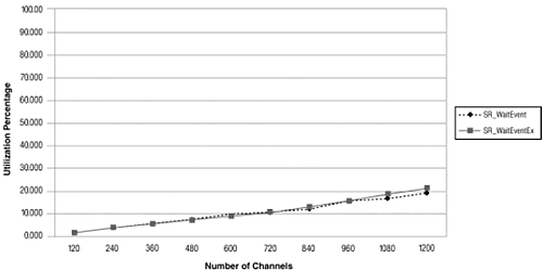 擴展異步模式使用了36%到28%. 系統(tǒng)顯示了很高的擴展性, CPU使用率和通道數(shù)成線形增長.