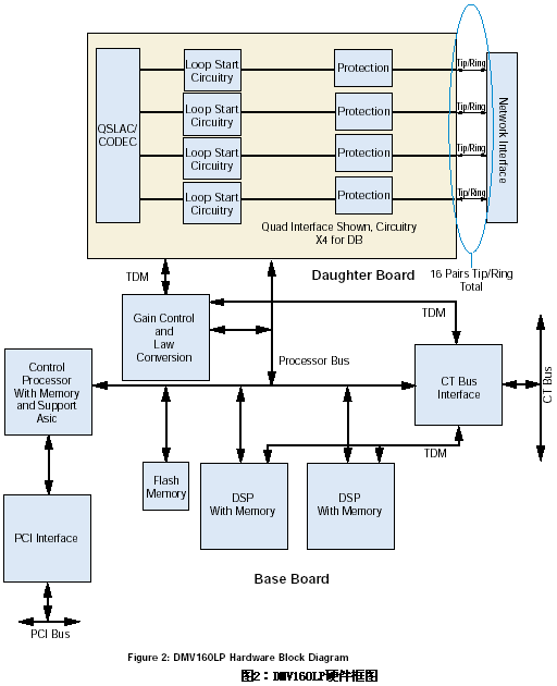 當(dāng)板卡上的呼叫處理資源被利用的時候,網(wǎng)絡(luò)信號就被提取出來并且被送到板卡上的控制處理器中,該處理器可以改變信道狀態(tài)而且可以通過共享的RAM和主機的PCI總線將信道事件傳送給應(yīng)用程序接口。