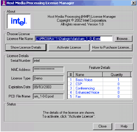 1.打開HMP許可證管理器,具體方法::開始> 程序 > DialogicHMP 1.0 > HMP