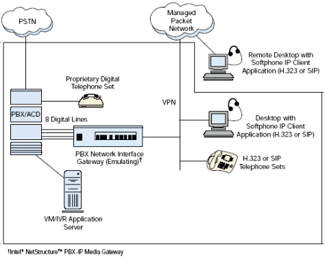 PBX-IP 媒體網(wǎng)關(guān)可以把IP電話(huà)連接到傳統(tǒng)PBX上, 給PBX集成了網(wǎng)絡(luò)應(yīng)用, 擴(kuò)展了PBX, 集成了企業(yè)局域網(wǎng)或廣域網(wǎng)語(yǔ)音,