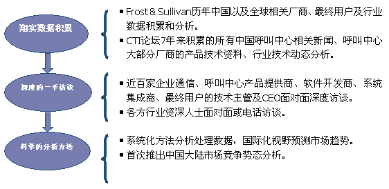 Frost & Sullivan 和 CTI論壇(m.bjforward.com)共同組成的調(diào)研小組,在查閱了大量資料的基礎之上,以企業(yè)通信及呼叫中心的設備應用、投資計劃以及相關廠商的市場表現(xiàn)為出發(fā)點,通過對企業(yè)通信及呼叫中心重要應用企業(yè)、在市場占主導地位的二十多家設備廠商、二十多家軟件開發(fā)商、十幾家系統(tǒng)集成商、數(shù)家外包運營商的深度訪談,參閱內(nèi)部相關報告及數(shù)據(jù)庫,對數(shù)據(jù)的來源和數(shù)據(jù)的準確性進行了詳細核對與論證;憑借參與調(diào)研人員的多年從業(yè)經(jīng)